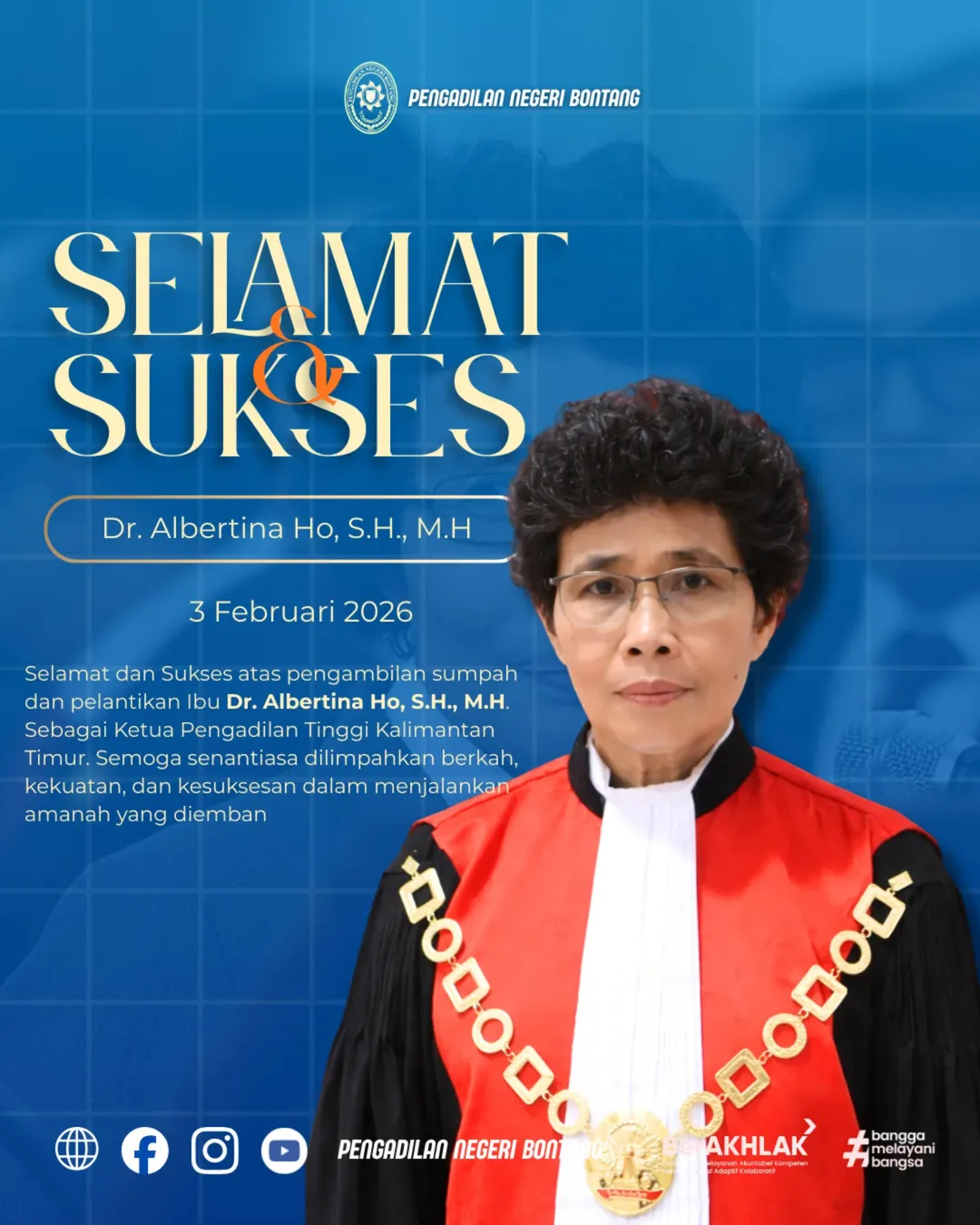 Pengadilan Negeri Bontang mengucapkan Selamat dan Sukses atas pengambilan sumpah dan pelantikan Dr. Albertina Ho, S.H., M.H. sebagai Ketua Pengadilan Tinggi Kalimantan Timur.