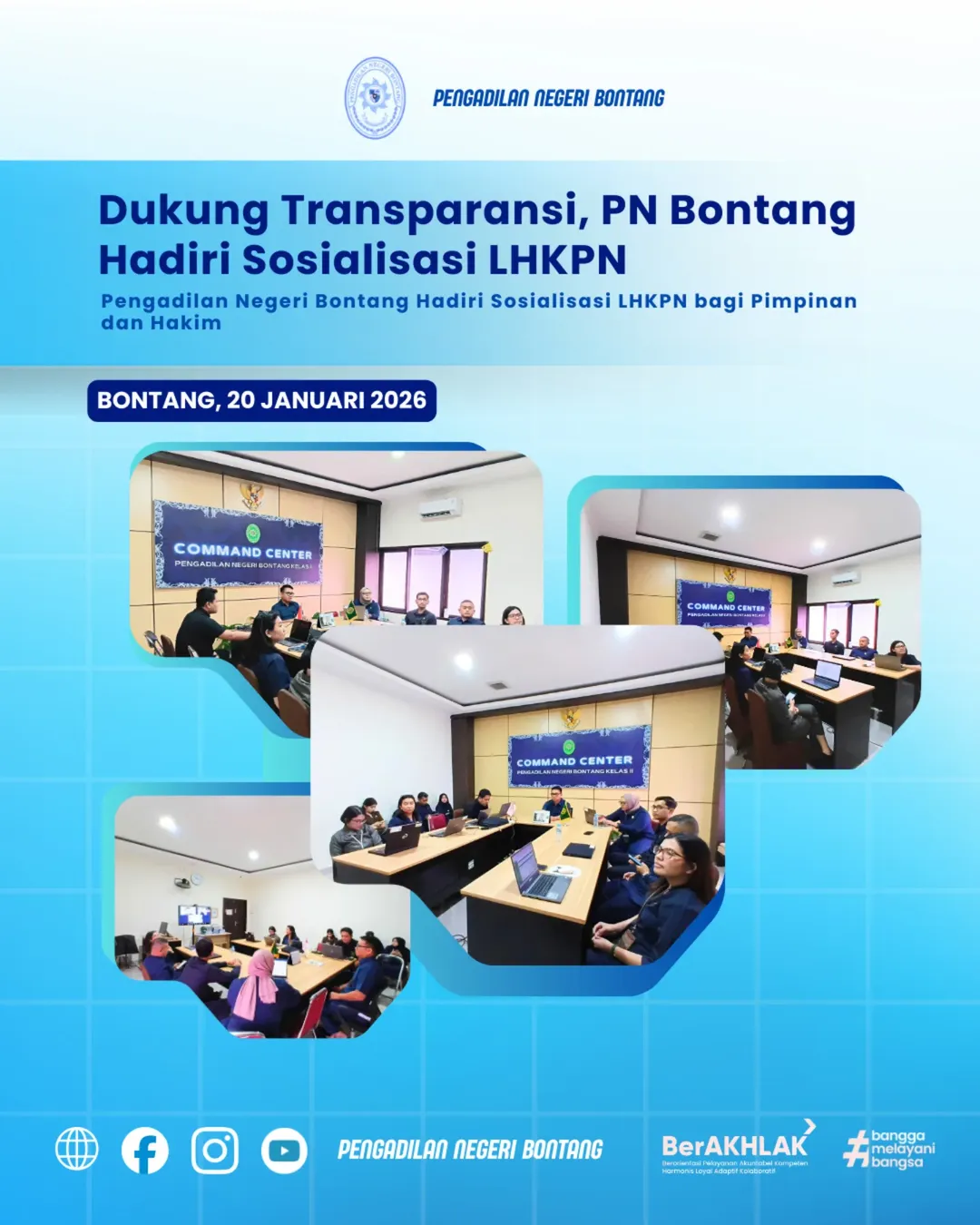Pengadilan Negeri Bontang turut menghadiri kegiatan Sosialisasi Laporan Harta Kekayaan Penyelenggara Negara (LHKPN) yang diselenggarakan oleh Direktorat Jenderal Badan Peradilan Umum Mahkamah Agung Republik Indonesia bekerja sama dengan Komisi Pemberantasan Korupsi (KPK) Republik Indonesia. Kegiatan ini bertujuan untuk meningkatkan pemahaman serta kepatuhan aparatur peradilan terhadap kewajiban pelaporan harta kekayaan sesuai ketentuan peraturan perundang-undangan.