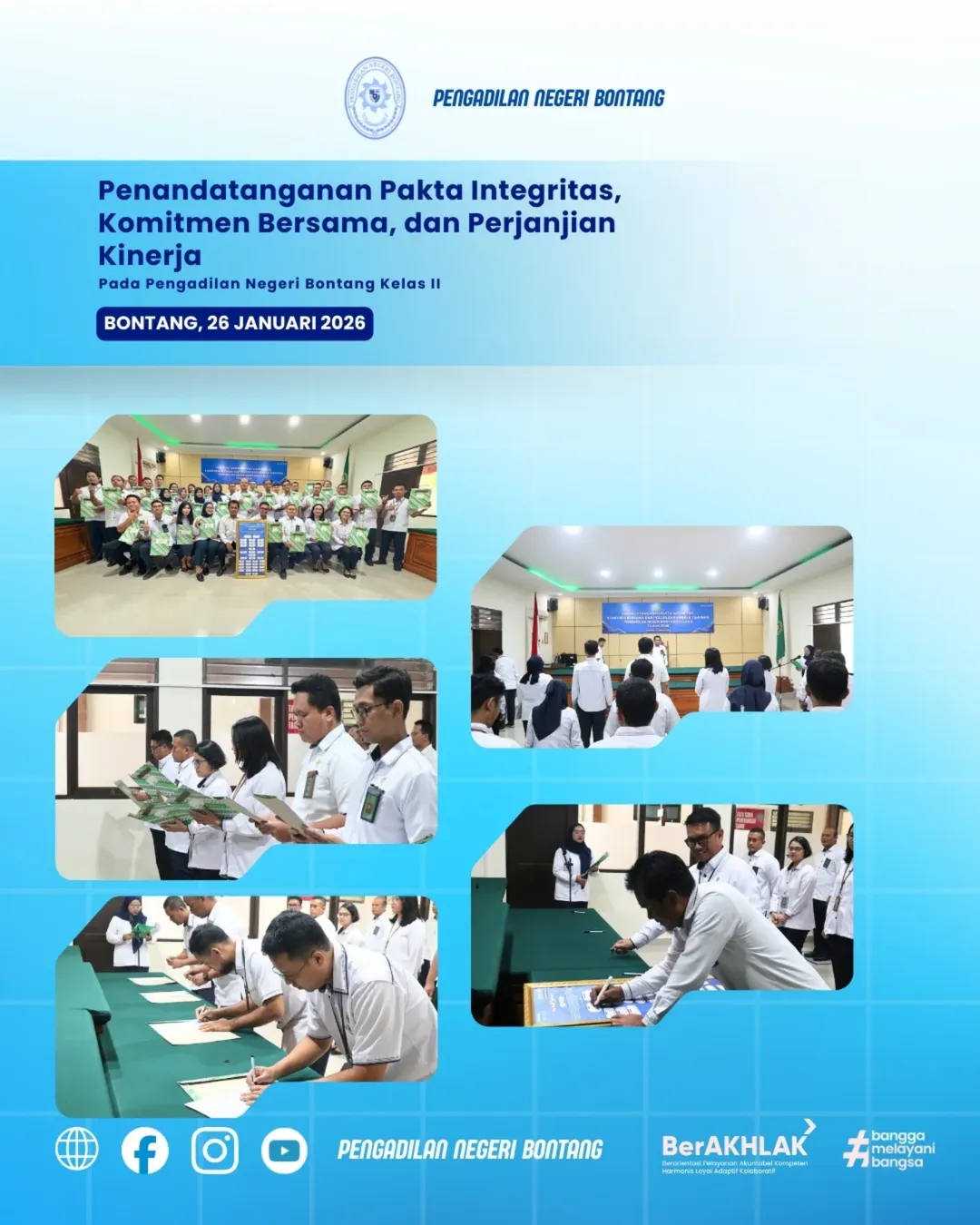 Bontang, 26 Januari 2026 — Pengadilan Negeri Bontang Kelas II melaksanakan kegiatan Penandatanganan Pakta Integritas, Komitmen Bersama, dan Perjanjian Kinerja sebagai wujud nyata komitmen seluruh aparatur dalam menjaga integritas, profesionalitas, serta peningkatan kinerja aparatur peradilan.