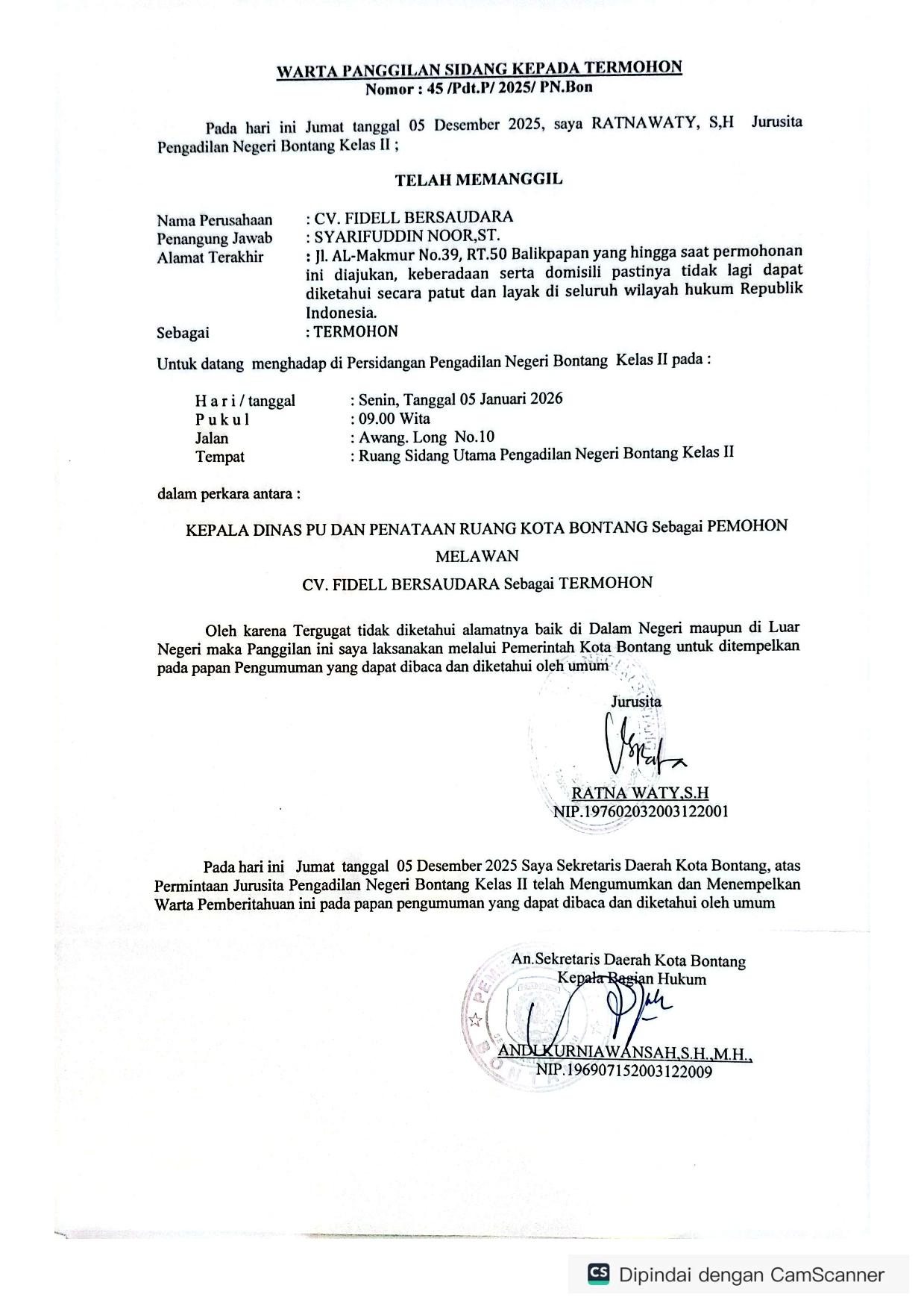 BERITA PANGGILAN SIDANG KEPADA TERMOHON.