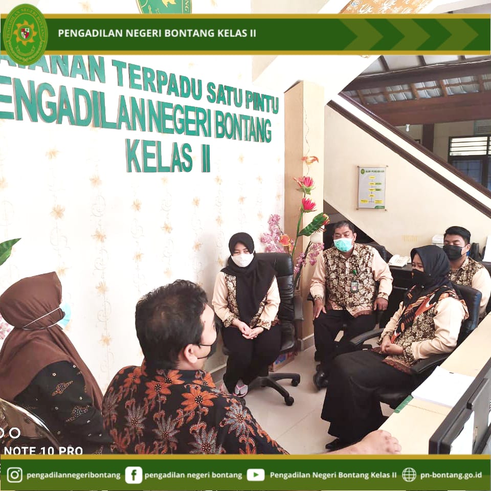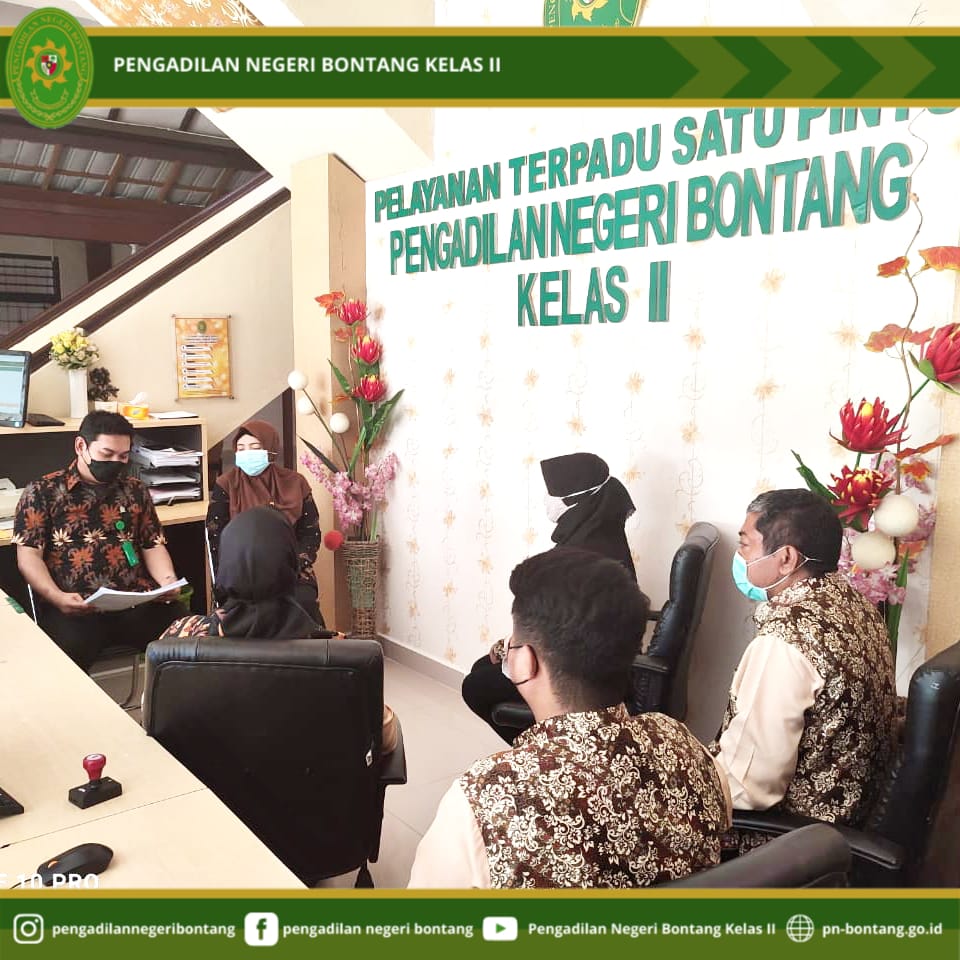 Pada hari Kamis, 3 Juni 2021 bertempat di Pengadilan Negeri Bontang Kelas II, Jalan Awang Long Nomor 10, Bontang Baru, Kecamatan Bontang Utara, Kota Bontang, Hakim Pengawas (Supervisi) Pelayanan Terpadu Satu Pintu (PTSP) pada Pengadilan Negeri Bontang Kelas II, Bapak Parlin Mangatas Bona Tua, S.H. dan Ibu Ratih Mannul Izzati, S.H., M.H. melakukan pengawasan terhadap jalannya pelayanan pada PTSP. Pada kesempatan tersebut Hakim Pengawas PTSP menyampaikan mengenai mengutamakan pelayanan prima, dimana Petugas PTSP sebagai garda depan dari Pengadilan Negeri Bontang Kelas II dalam memberikan layanan prima kepada masyarakat pencari keadilan.Selain itu sarana dan prasarana penunjang pelayanan juga harus senantiasa dijaga penggunaannya agar dapat befungsi dengan baik sehingga dapat memberikan pelayanan yang maksimal.