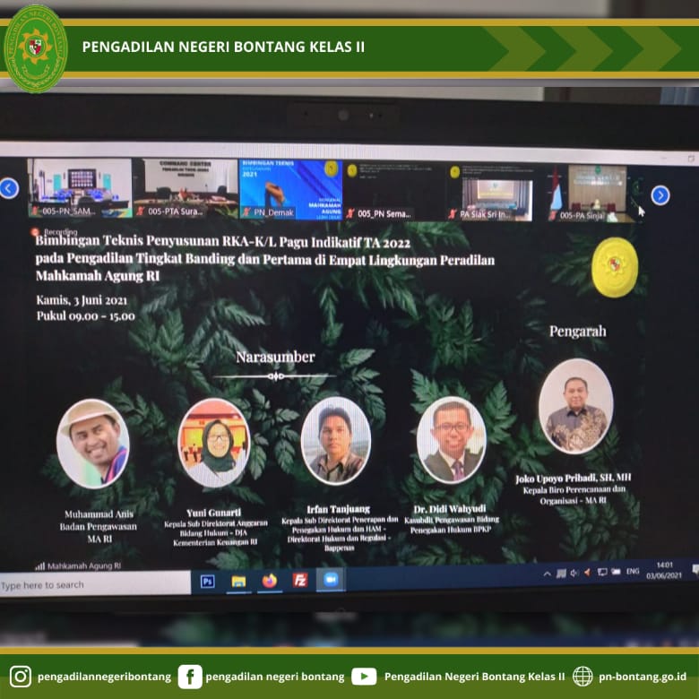 Pada hari Kamis, 3 Juni 2021 bertempat di Ruangan Sub Bagian Perencanaan, Teknologi Informasi dan Pelaporan (PTIP), Pengadilan Negeri Bontang Kelas II, Jalan Awang Long Nomor 10, Bontang Baru, Kecamatan Bontang Utara, Kota Bontang, Sekretaris, Bapak Riza Putra Perdana, S.T. dan Kasubbag PTIP, Ibu Ita Masyita, S.Kom telah mengikuti Bimbingan Teknis Penyusunan RKA-K/L DIPA 01 TA 2022 pada Pengadilan Tingkat Banding dan Pertama di Empat Lingkungan Peradilan Mahkamah Agung secara virtual.