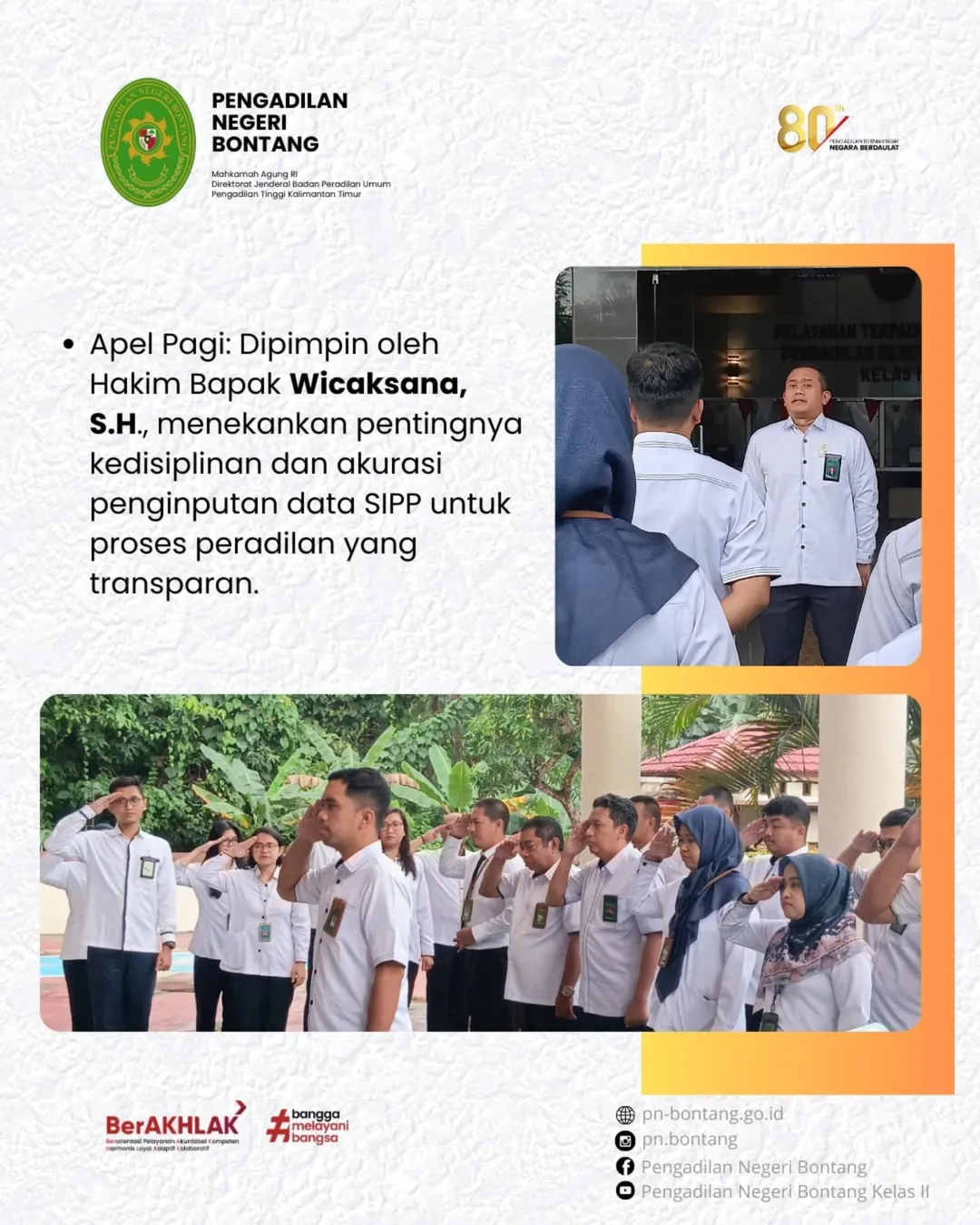 Acara ini dipimpin langsung oleh Ketua Pengadilan Negeri Bontang, Bapak Rahmat Dahlan, S.H., dan dihadiri oleh seluruh hakim, pejabat struktural, fungsional, serta staf Pengadilan Negeri Bontang.