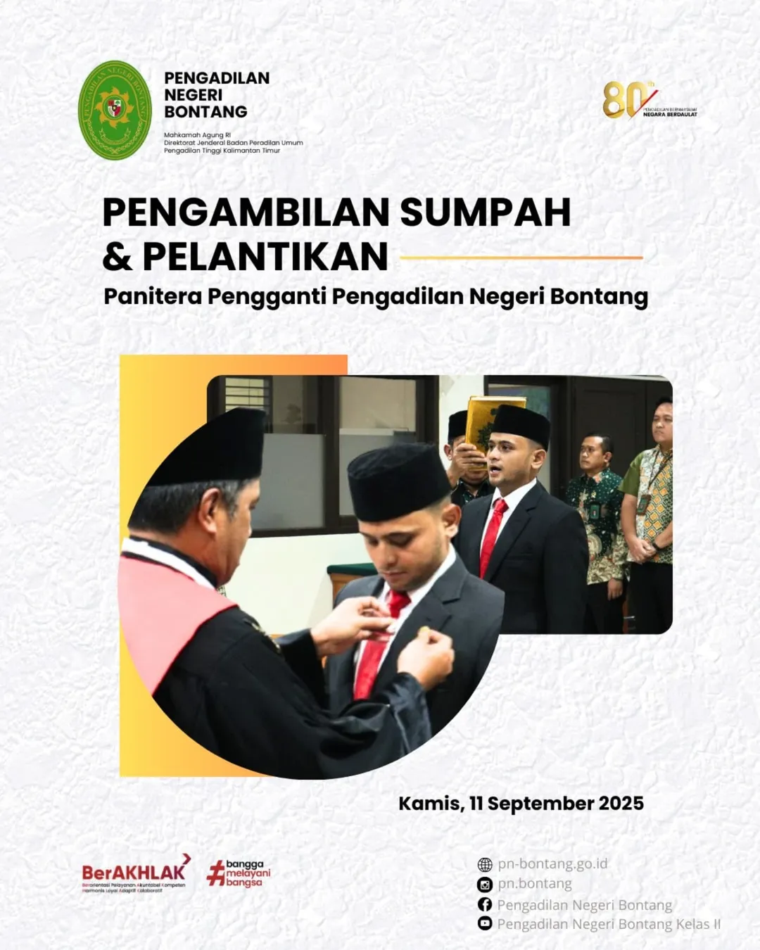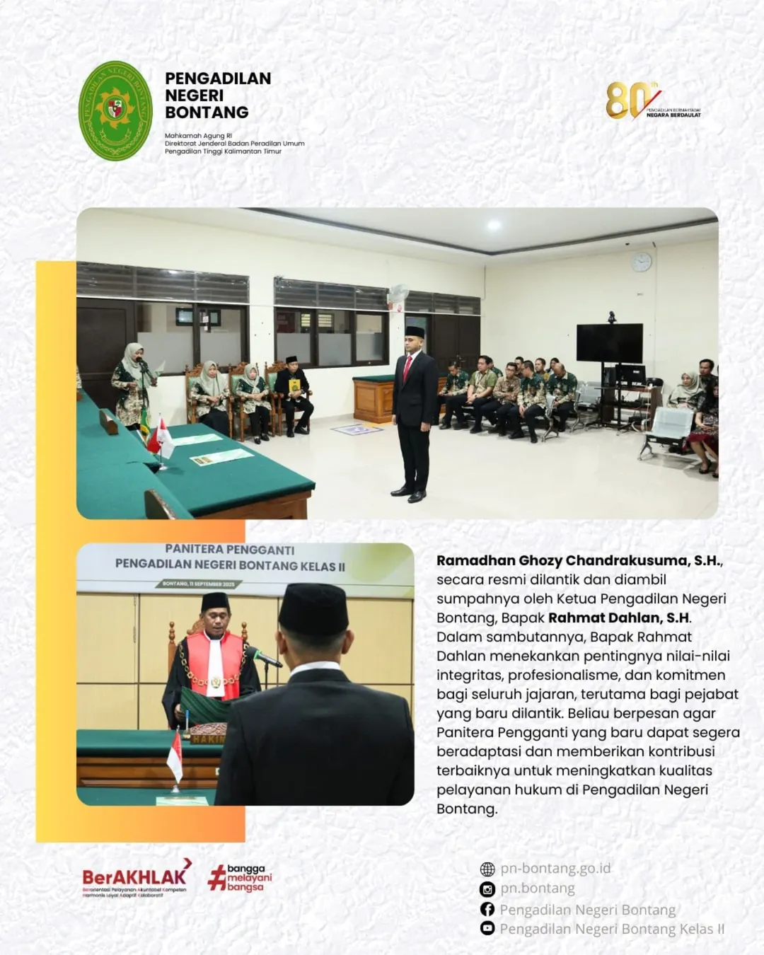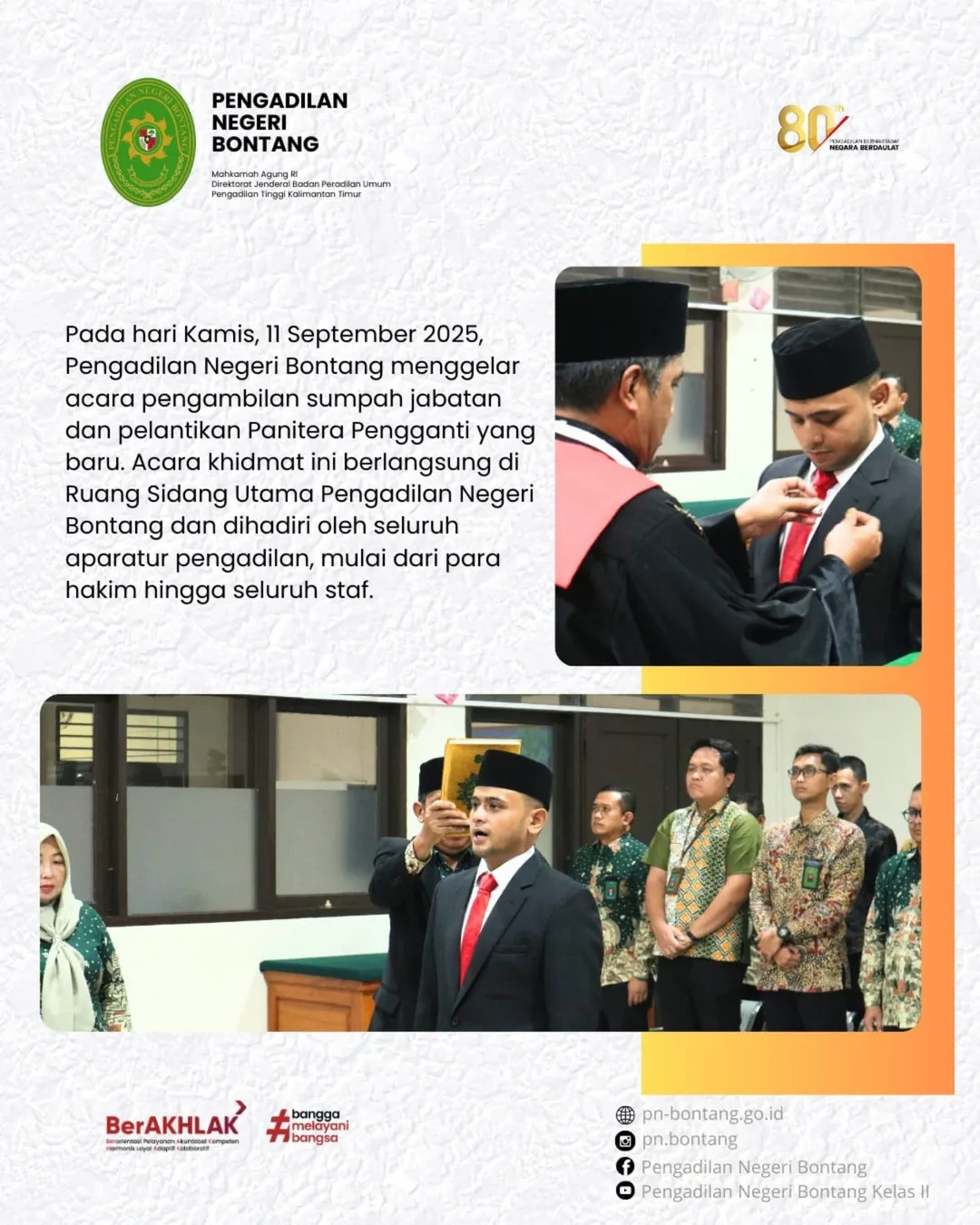 Bontang, 11 September 2025 - Pengadilan Negeri Bontang melaksanakan upacara pengambilan sumpah jabatan dan pelantikan Panitera Pengganti, yang berlangsung di Ruang Sidang Utama Pengadilan Negeri Bontang pada Kamis, 11 September 2025.