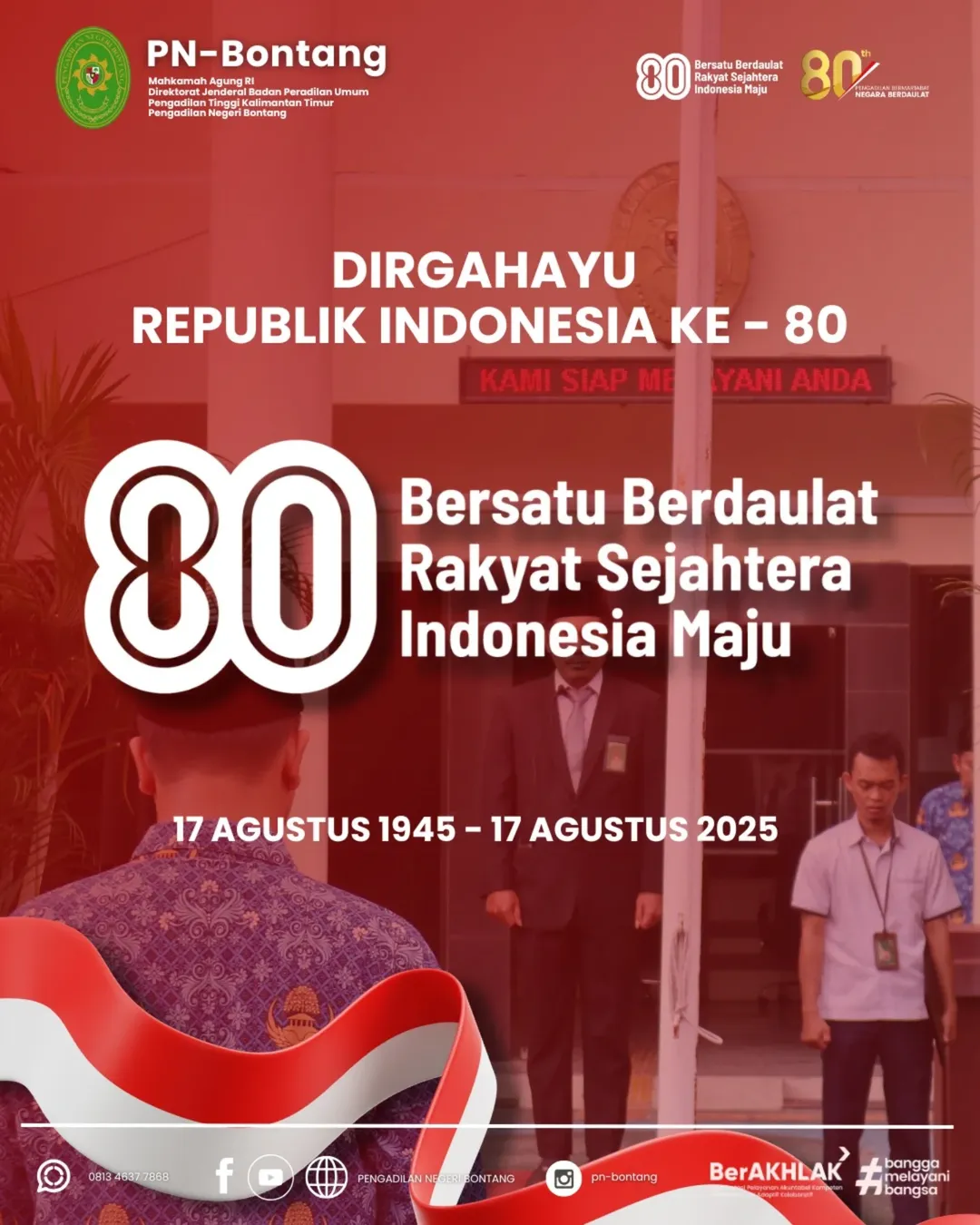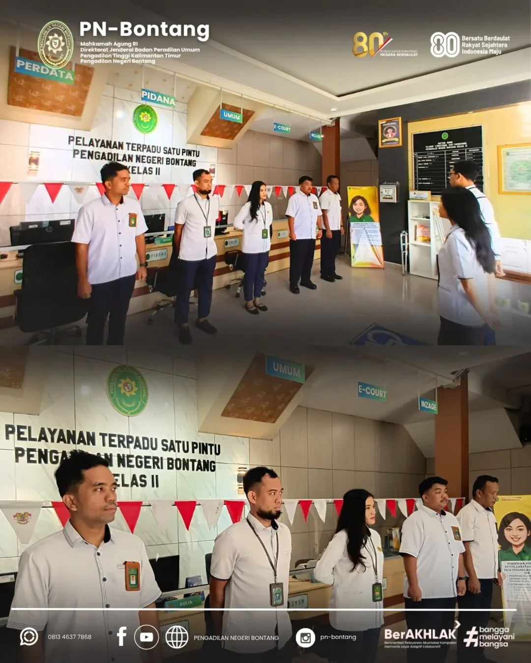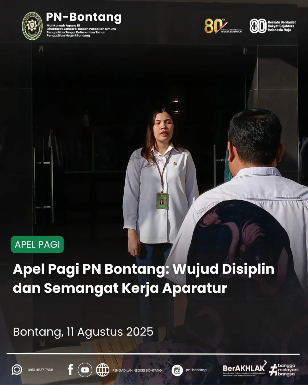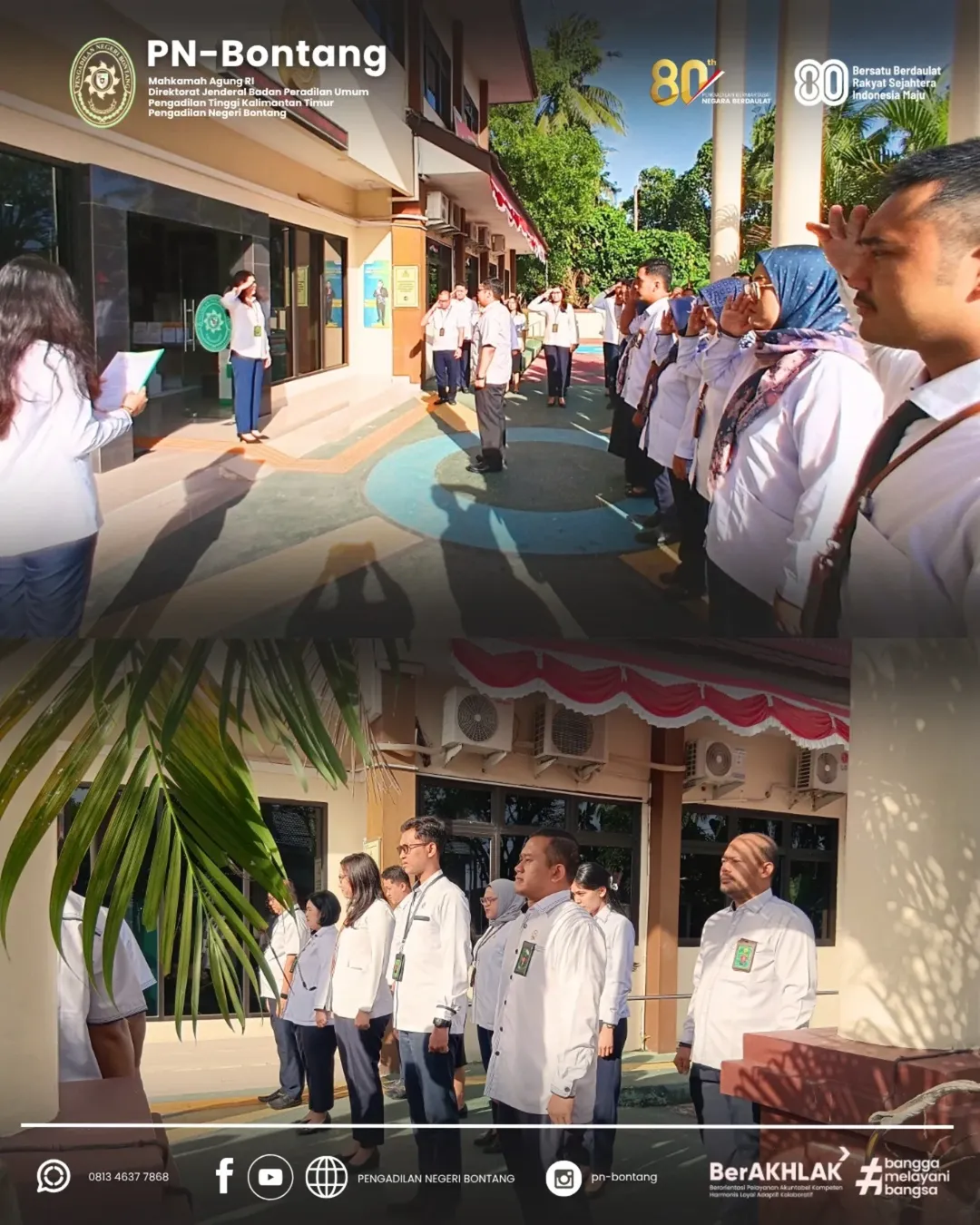 Bontang – Pengadilan Negeri Bontang melaksanakan apel pagi pada Senin, 11 Agustus 2025, bertempat di halaman kantor PN Bontang. Kegiatan rutin ini diikuti oleh seluruh aparatur Pengadilan Negeri Bontang, mulai dari pimpinan, hakim, pejabat struktural dan fungsional, hingga staf dan tenaga PPNPN.