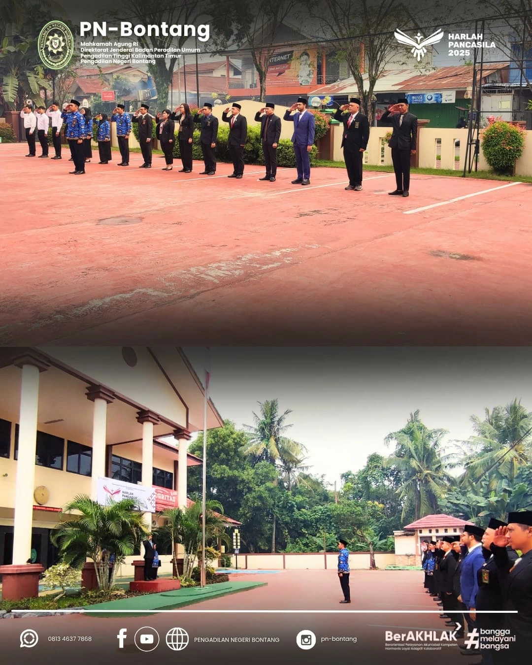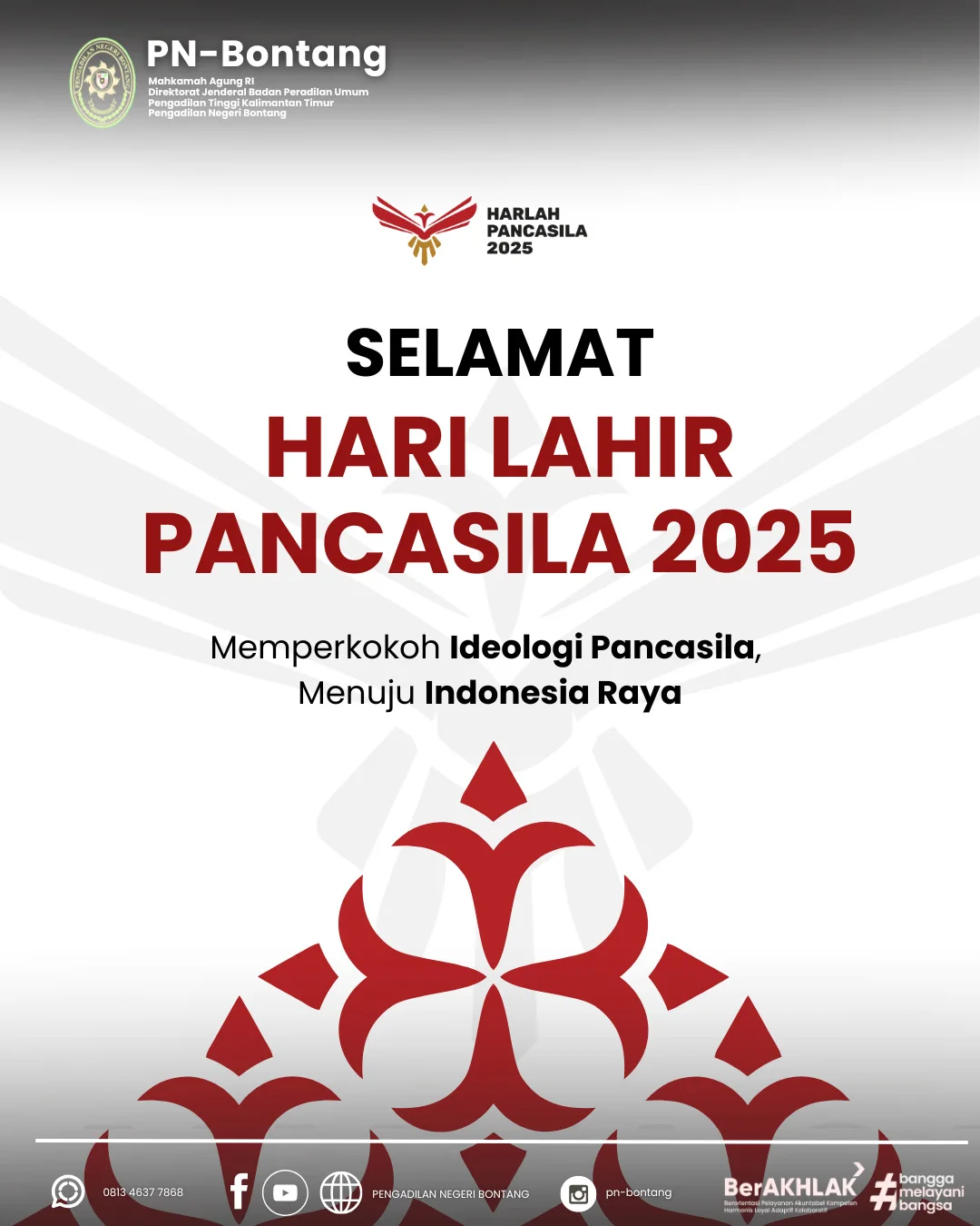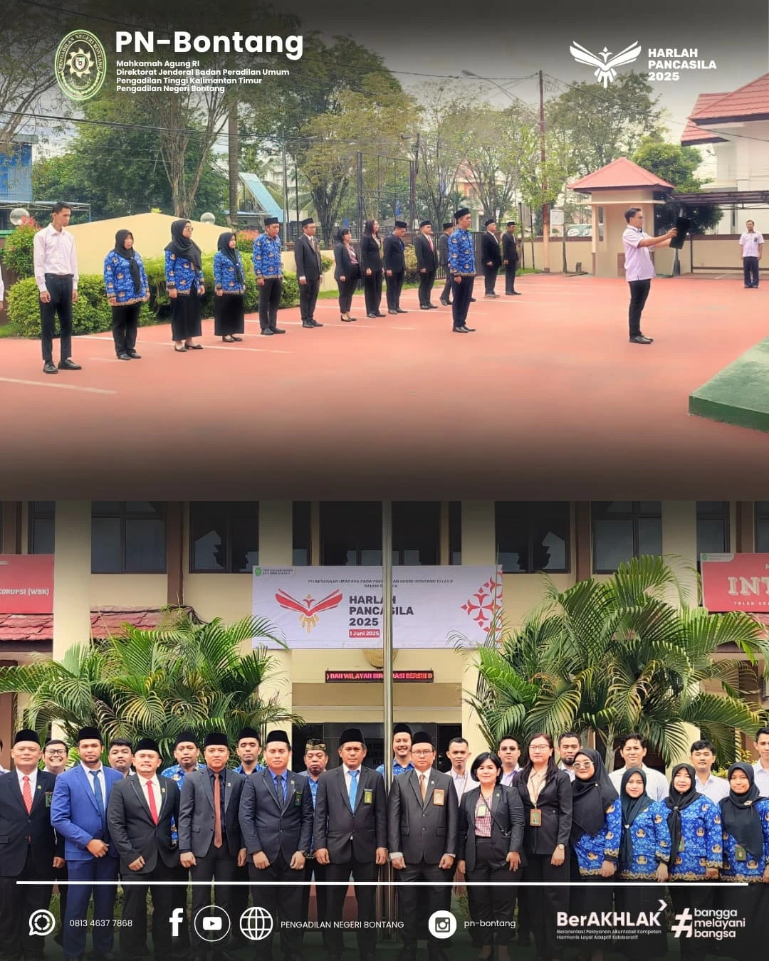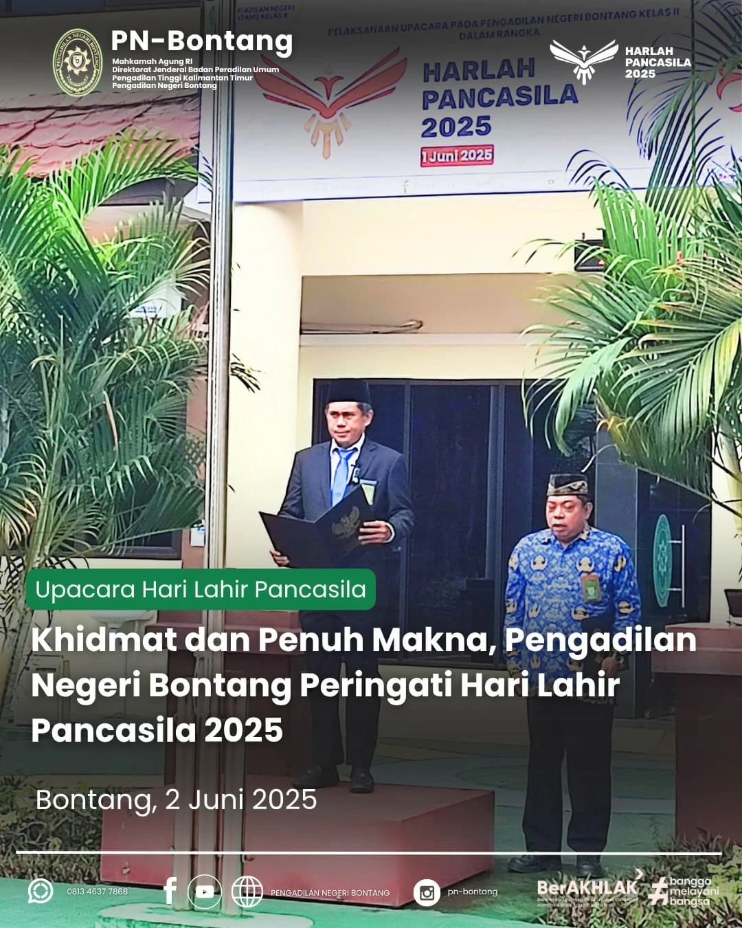 Pada Hari Senin, 2 Juni 2025 Peringatan Hari Lahir Pancasila di Pengadilan Negeri Bontang berlangsung khidmat Upacara yang digelar di halaman kantor PN Bontang ini dipimpin oleh Pembina Upacara, Bapak Rahmat Dahlan, S.H., Ketua Pengadilan Negeri Bontang, dan diikuti oleh seluruh aparatur PN Bontang. Momen ini menjadi pengingat untuk terus mengamalkan nilai-nilai Pancasila dalam kehidupan bermasyarakat, berbangsa, dan bernegara. 🙏