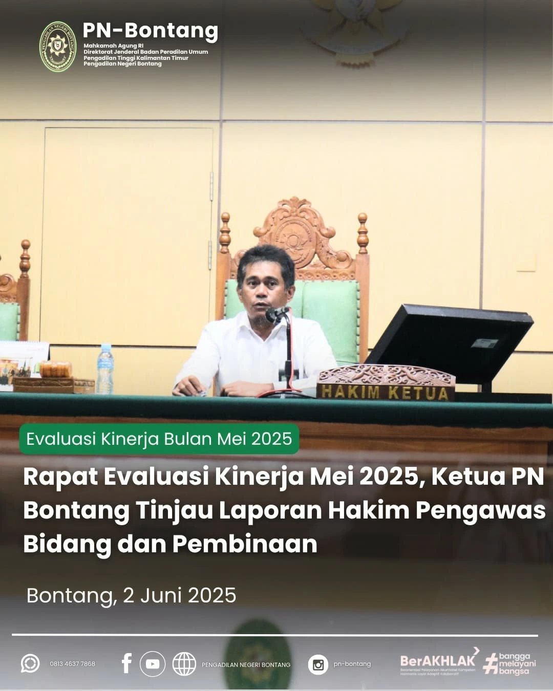 Bontang, 22 April 2025 - Rapat Evaluasi Kinerja Mei 2025 di Pengadilan Negeri Bontang Dipimpin oleh Ketua PN Bontang, Bapak Rahmat Dahlan, S.H., rapat ini membahas laporan hakim pengawas bidang dan pembinaan untuk meningkatkan kualitas pelayanan peradilan. 💼 Komitmen untuk keadilan yang lebih baik terus diwujudkan!